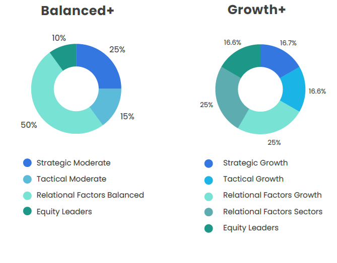 The MMP Growth+ portfolio is a multi-manager, multi-strategy blended model appropriate for moderately aggressive to aggressive investors, consisting of 25% Relational Factors Growth, 25% Relational Factors Sectors, 16.7% Strategic Growth, 16.6% Tactical Growth, and 16.6% Equity Leaders. The portfolio targets an 80% equity / 20% fixed income allocation, blending strategic, tactical, sector rotation, and individual equity investment styles to create a truly diverse, risk-managed approach for investors seeking a moderately aggressive risk profile. The MMP portfolios are designed for high-net worth individuals. Typical allocation: 80% Equity / 20% Fixed Income.