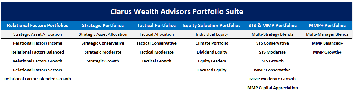 Clarus Wealth Advisors provides a diverse platform of portfolio management solutions at competitive cost. We offer an array of varying methodologies and risk profiles to suit any client type. Below you can find information on each series. If you’d like to speak with our experienced investment advisory team, please call us at 623-583-6840 or contact us.
